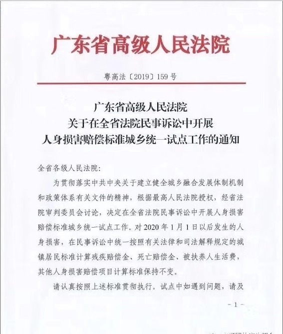廣東省高級人民法院關于在全省法院民事訴訟中開展人身損害賠償標準城鄉統一試點工作的通知