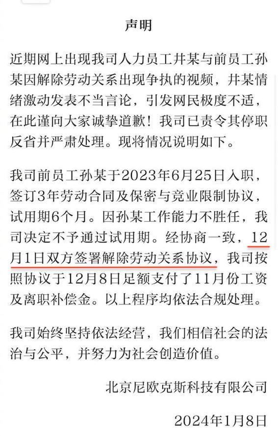 現在網上出現了一份北京尼歐克斯科技有限公司出具的《聲明》,作為專業人士,我不關心這起事件的輿情和起因,而只關心其中的核心細節。如果這份《聲明》確實是事件當事人所在的公司發布的聲明,如果其中的核心內容確實是真實的,尼歐克斯公司已和孫某(即事件中的勞動者)于2023年12月1日“簽署解除勞動關系協議”,那孫某與尼歐克斯公司是協商一致解除勞動合同,根據《最高人民法院關于審理勞動爭議案件適用法律問題的解釋(一)》(法釋〔2020〕26號)第35條的規定,只要該協議的內容不違反法律、行政法規的強制性規定,且不存在欺詐、脅迫或者乘人之危情形的,就應當認定有效。同時,如果該協議不存在重大誤解或者顯失公平的情形,當事人也不可以請求撤銷。