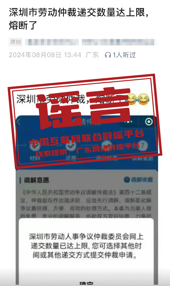 最近,在微信、抖音、小紅書等平臺,“深圳勞動仲裁熔斷”“深圳市勞動人事爭議仲裁委員會網上遞交數量已達上限”等話題被炒作轉發,并與特定企業裁員傳聞關聯。記者采訪深圳市人力資源和社會保障局獲悉,此消息純屬謠言。