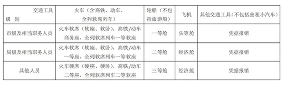 第八條 出差人員應當按規定等級乘坐交通工具。乘坐交通工具的等級見下表: