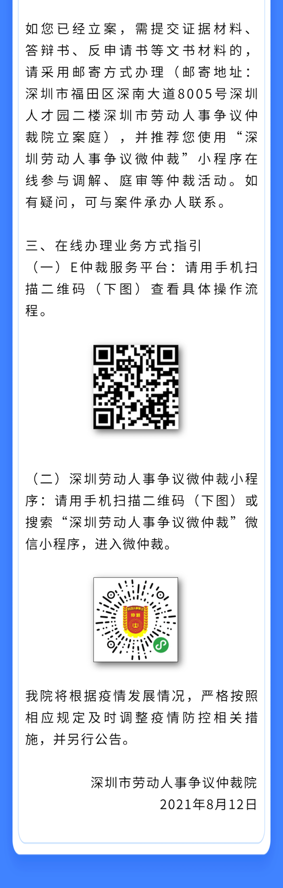 深圳市勞動人事爭議仲裁院關(guān)于調(diào)整疫情防控措施的公告(二)(2021-08-30)