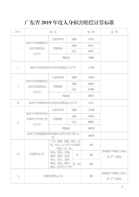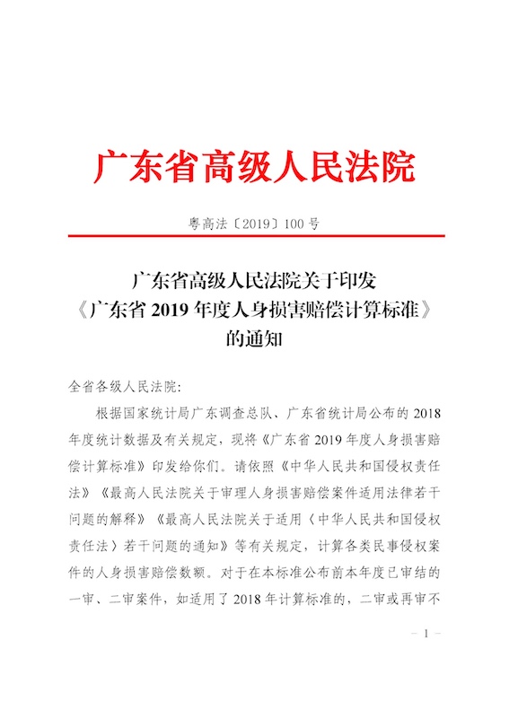 廣東省高級(jí)人民法院關(guān)于印發(fā)《廣東省2019年度人身?yè)p害賠償計(jì)算標(biāo)準(zhǔn)》的通知