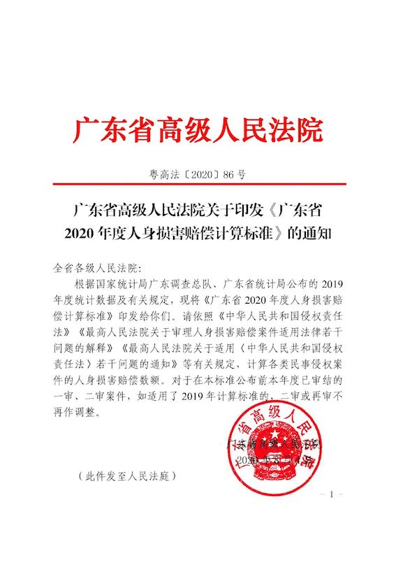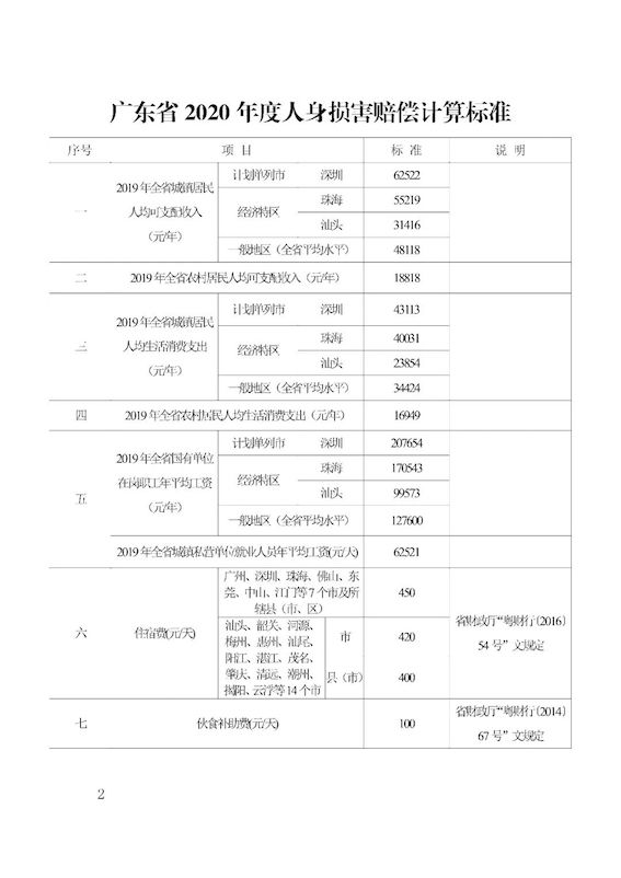 廣東省高級人民法院關于印發《廣東省2020年度人身損害賠償計算標準》的通知