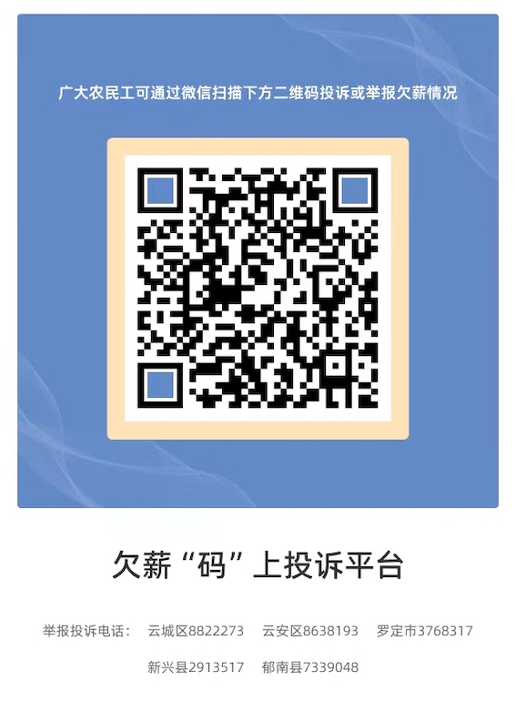 勞動者可掃描下方二維碼登錄云浮市欠薪“碼”上投訴平臺進行舉報投訴。